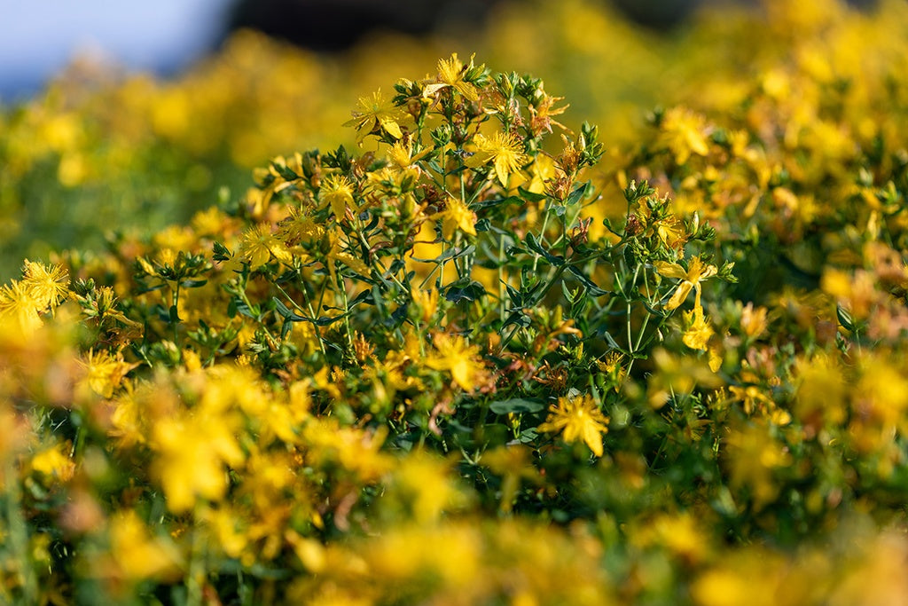 Johanniskraut ist eine Pflanze mit verschiedenen Heilwirkungen und gesundheitlichen Vorteilen. Aus den Blütenknospen lässt sich wunderbar ein entspannendes und entzündungshemmendes Öl herstellen. Dazu erntest du einfach du Blüten Anfang Juli, zermahlst sie und gibst diese in Olivenöl in die Sonne. Nach drei Wochen der Ruhe und Geduld ist dein Öl fertig, nun kannst du es aussieben und in eine Flasche abfüllen.